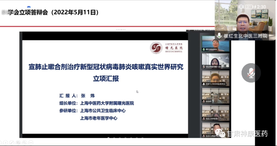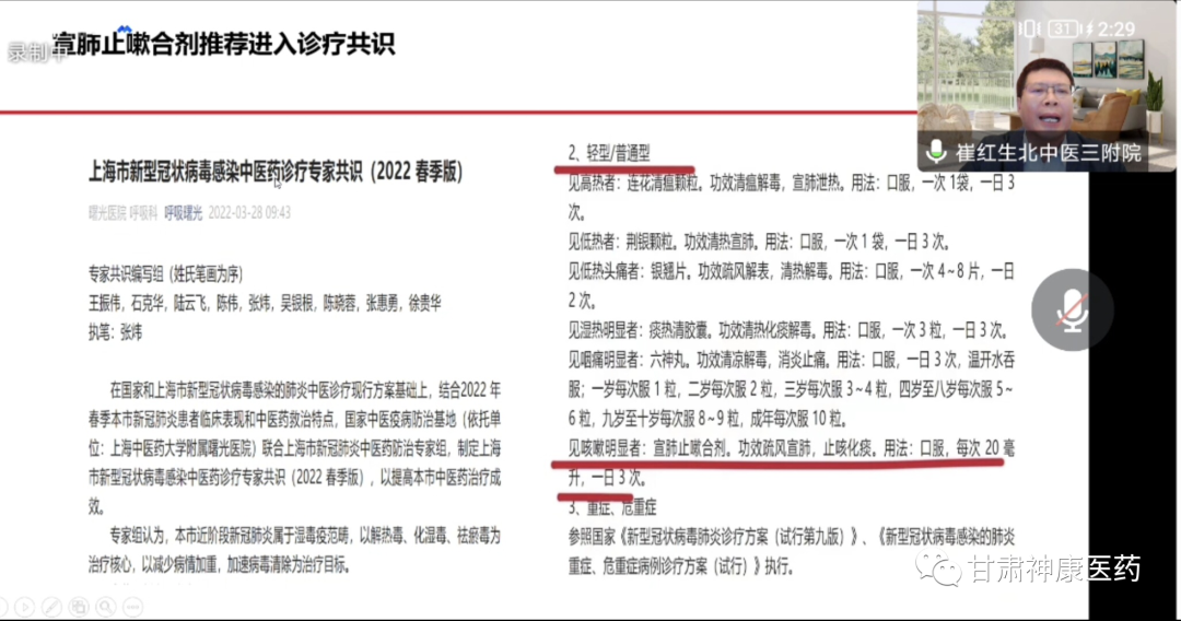 最后,崔教授對宣肺止嗽合劑在新冠肺炎疫情防控中展示出了獨特的治療價值和國藥魅力做了介紹,宣肺止嗽合劑在2022年3月,分別被列入《上海市新型冠狀病毒感染中醫藥診療專家共識》(2022年春季版)與《甘肅省新型冠狀病毒肺炎中醫藥防治方案(第四版)》。并于2022年5月,在上海中醫藥大學附屬曙光醫院開展了宣肺止嗽合劑治療新型冠狀病毒肺炎真實世界的相關研究,為后期循證證據搭建提供研究思路。