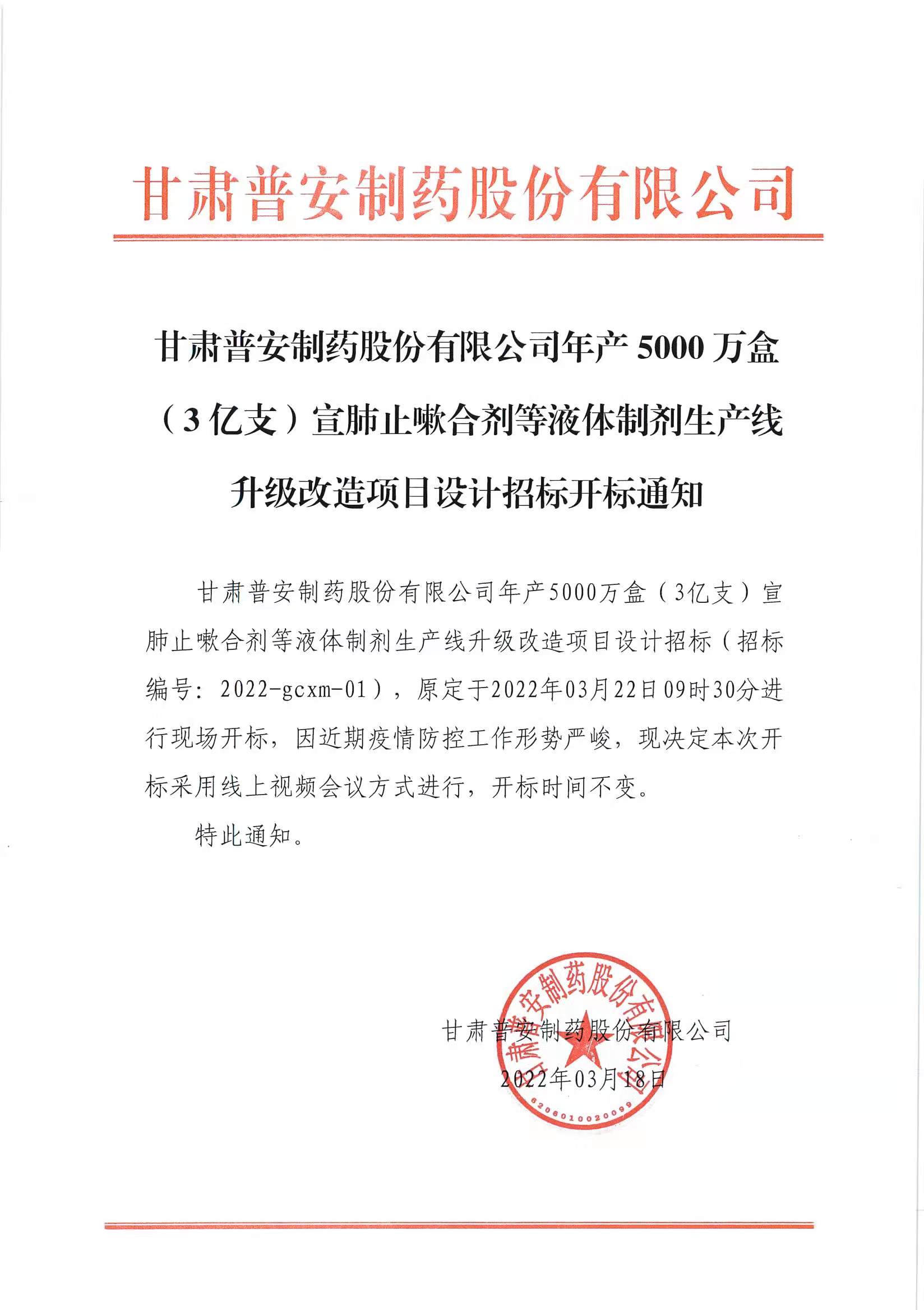 甘肅普安制藥股份有限公司年產(chǎn)5000萬盒(3億支)宣肺止嗽合劑等液體制劑生產(chǎn)線升級改造項(xiàng)目設(shè)計(jì)招標(biāo)開標(biāo)通知