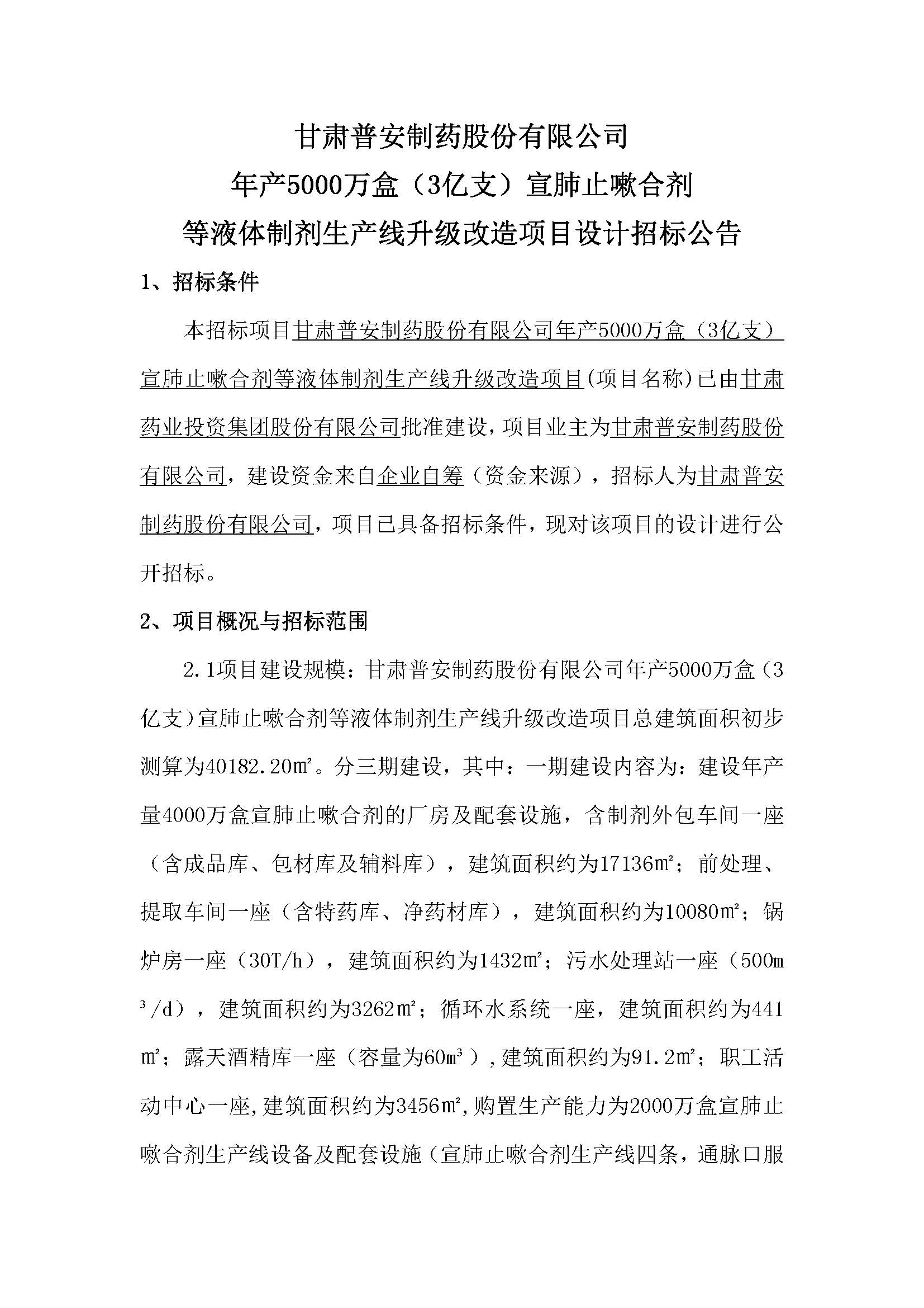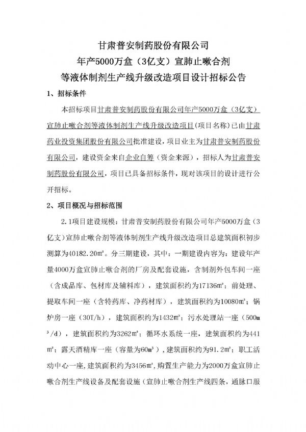 甘肅普安制藥股份有限公司年產(chǎn)5000萬盒(3億支)宣肺止嗽合劑等液體制劑生產(chǎn)線升級改造項目設計招標公告