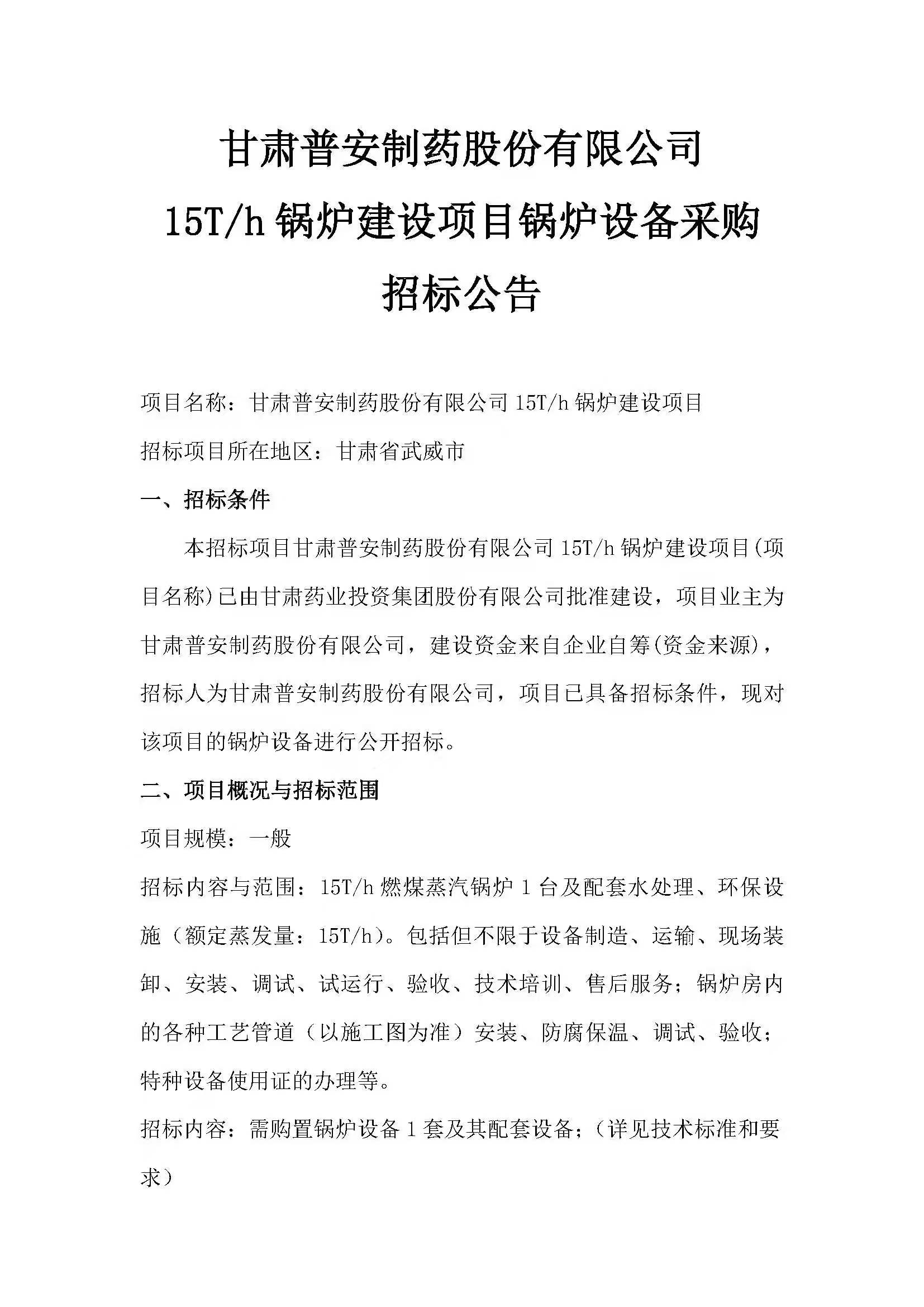 甘肅普安制藥股份有限公司15T/h鍋爐建設(shè)項(xiàng)目鍋爐設(shè)備采購招標(biāo)公告