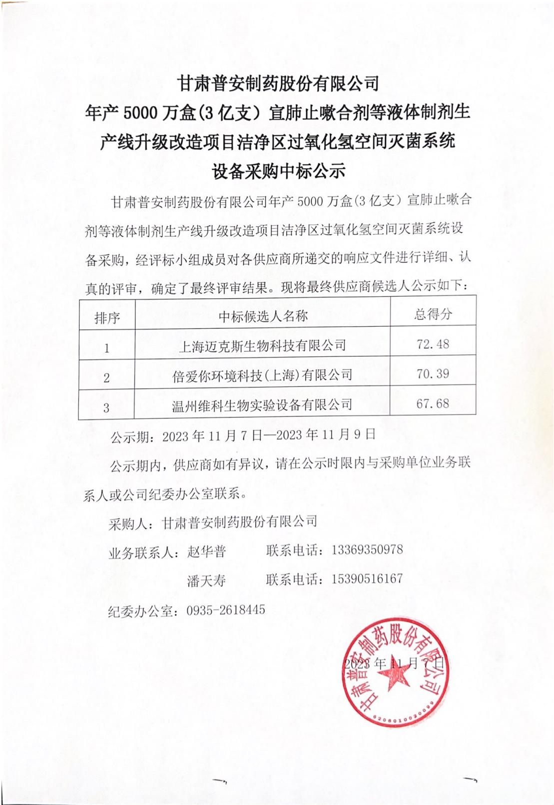 甘肅普安制藥股份有限公司年產(chǎn)5000萬盒(3億支)宣肺止嗽合劑等液體制劑生產(chǎn)線升級改造項目潔凈區(qū)過氧化氫空間滅菌系統(tǒng)設備采購中標公示
