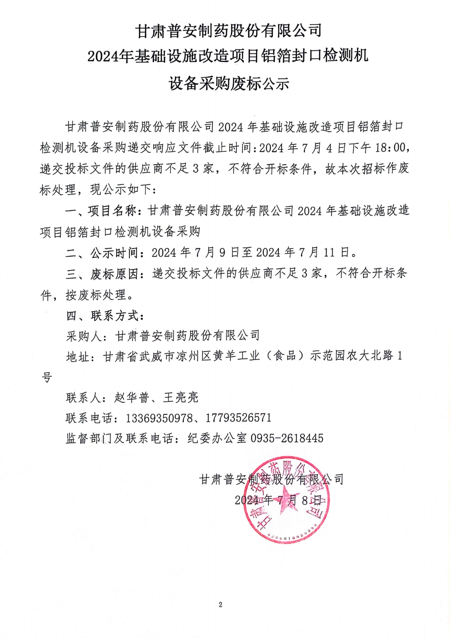 甘肅普安制藥股份有限公司2024年基礎(chǔ)設(shè)施改造項(xiàng)目鋁箔封口機(jī)設(shè)備采購廢標(biāo)公示