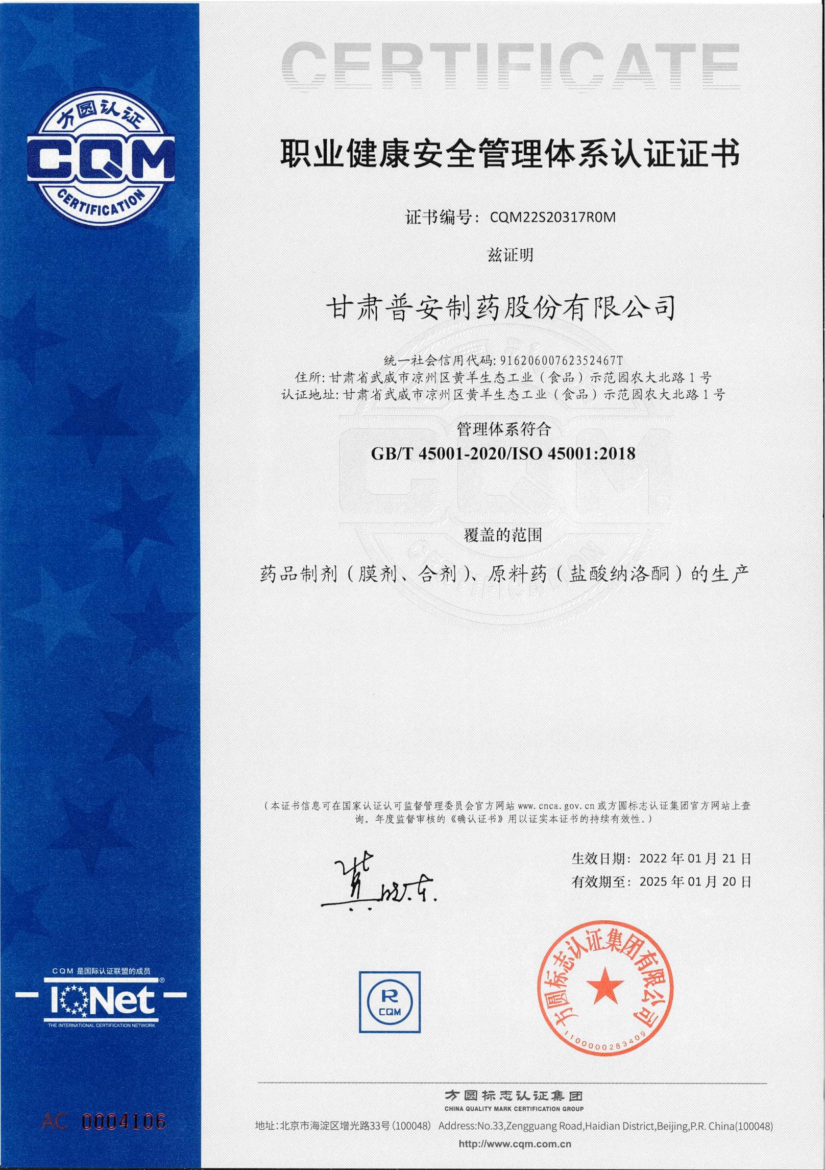 職業健康安全管理體系認證證書